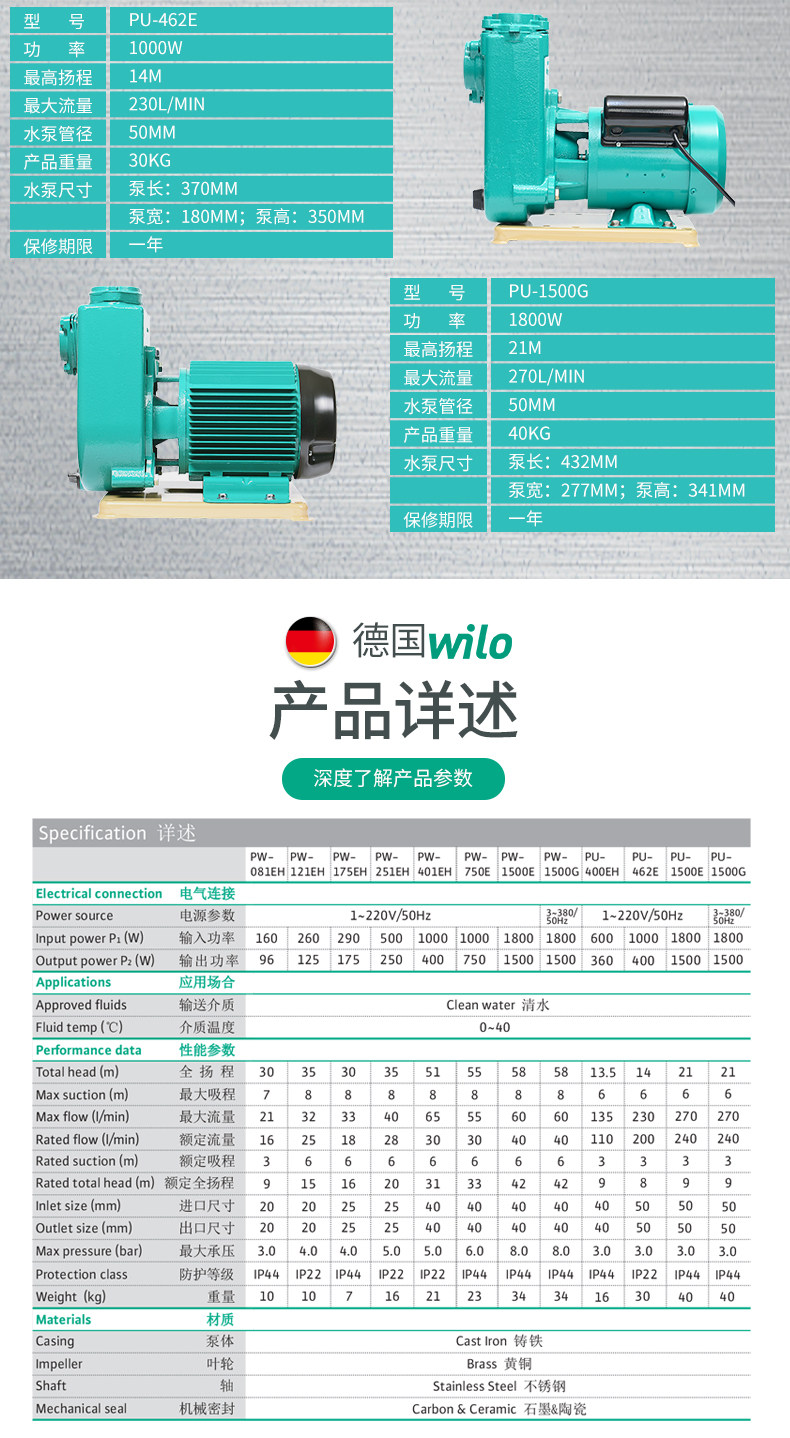PU-1500G/462E/400EH离心式农工业用泵自吸大流量抽水